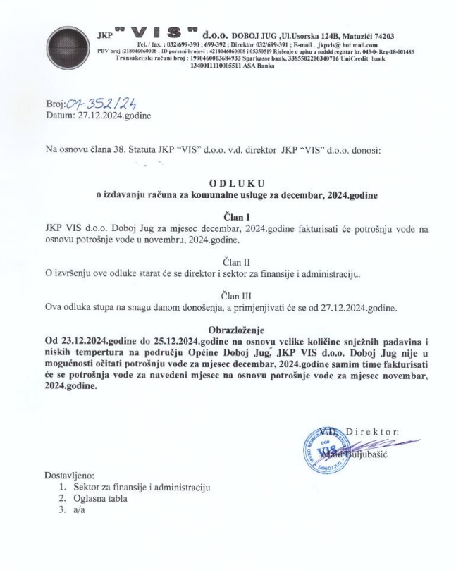 Odluka o izdavanju računa za komunalne usluge za decembar 2024.g.