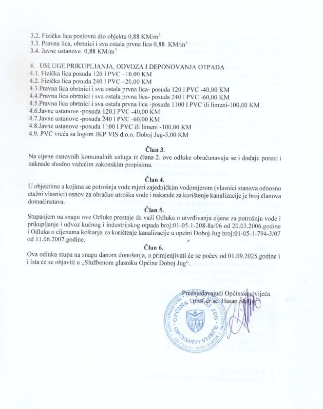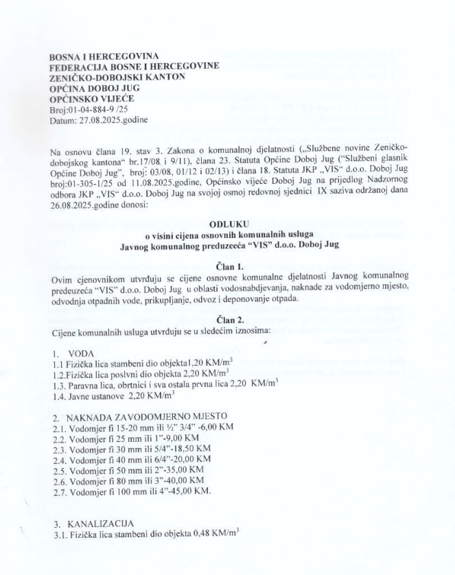 i Odluka o cijenama koštanja za korištenje kanalizacije u općini Doboj Jug broj:01-05-1-794-3/07